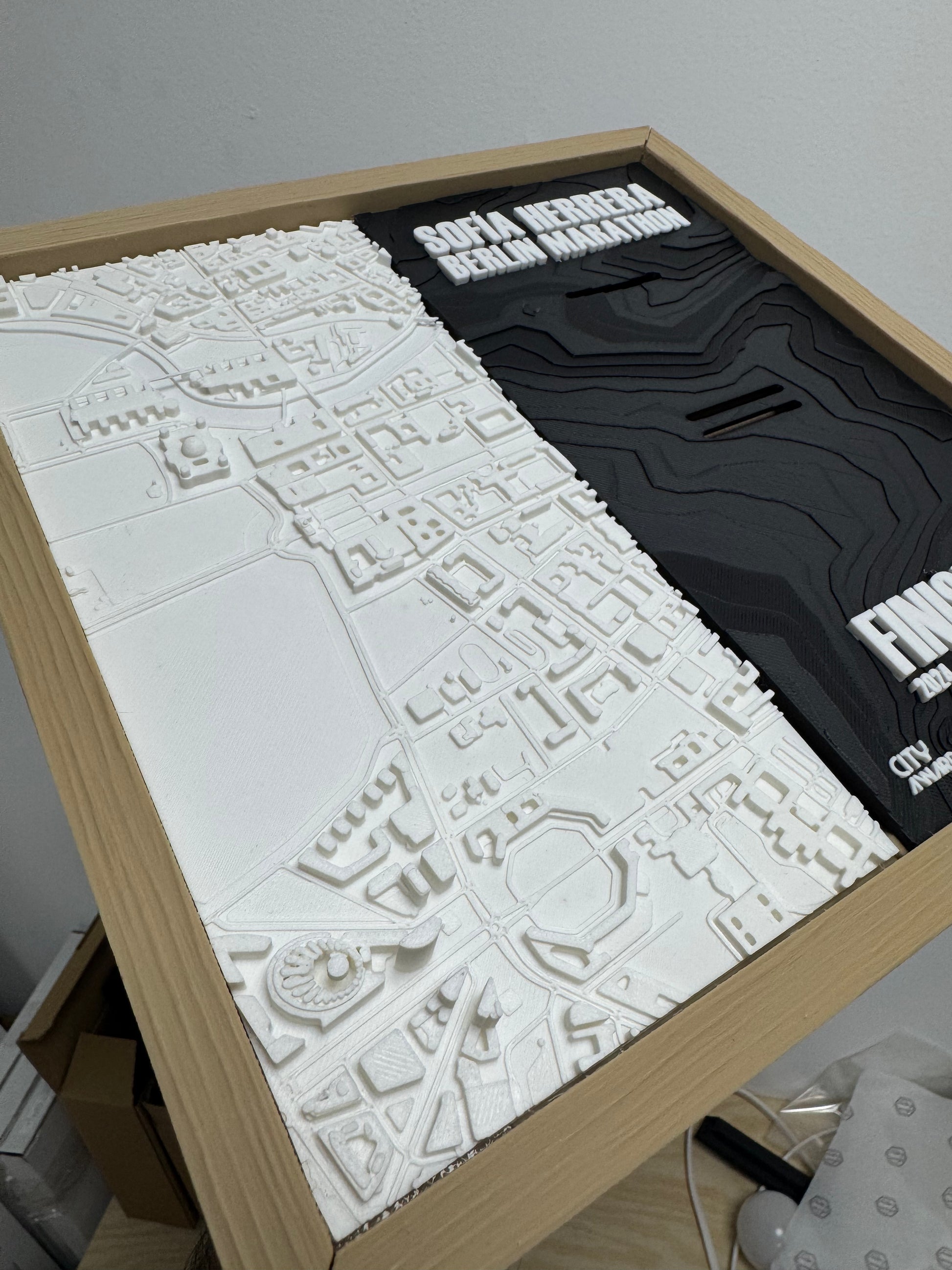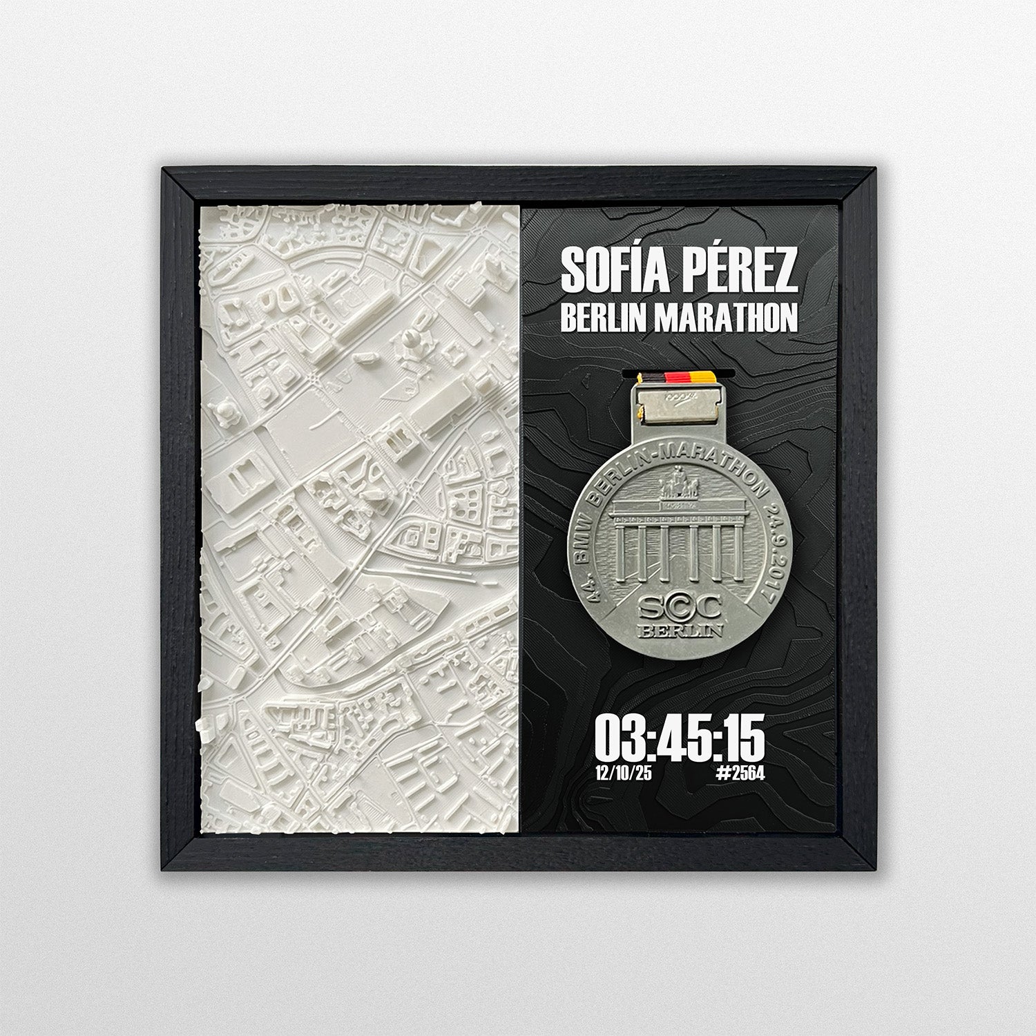 Impresión en 3D de ciudad de Berlin (zona de Alexanderplatz o Puerta de Brandenburgo). laca impresa en 3D personalizada con tus datos de la carrera: Nombre, Tiempo/Finisher, Num de corredor, Fecha, o el texto que tu quieras. Marco impreso en 3D: Negro con textura madera, Cafe claro con textura madera.
