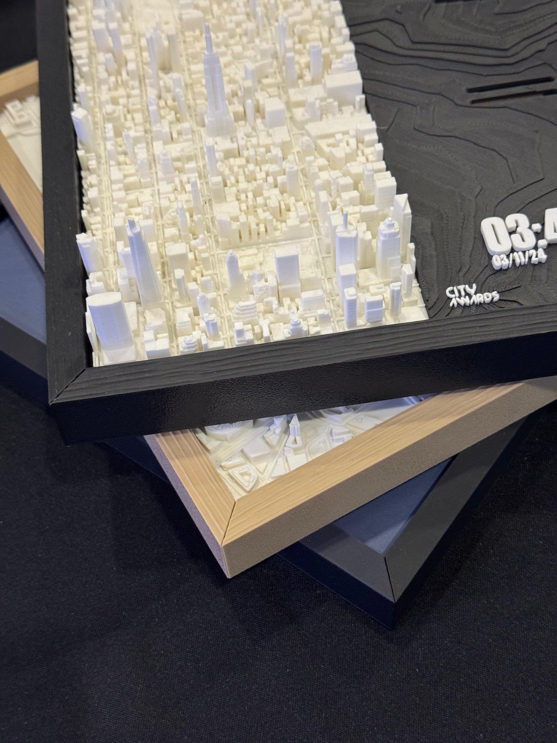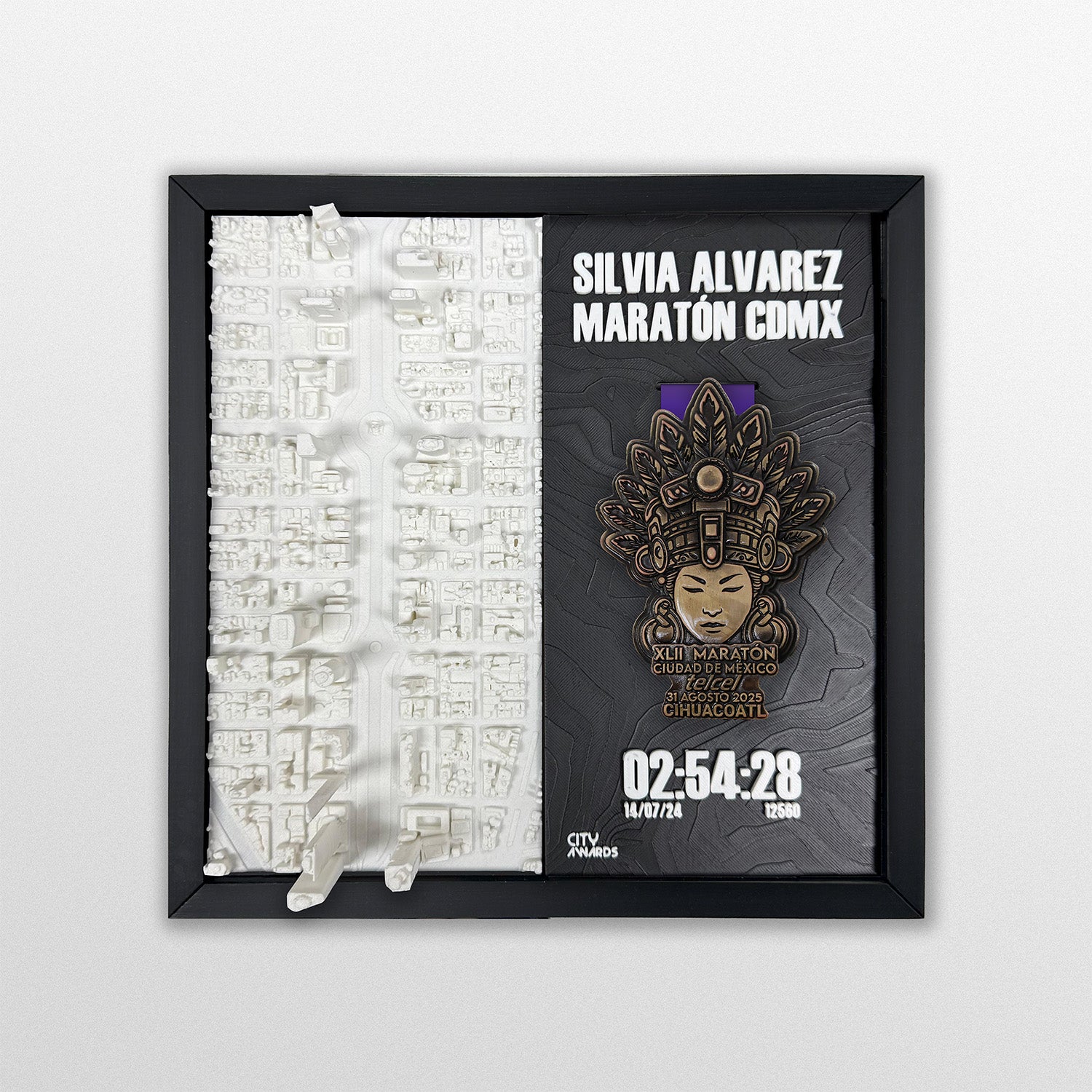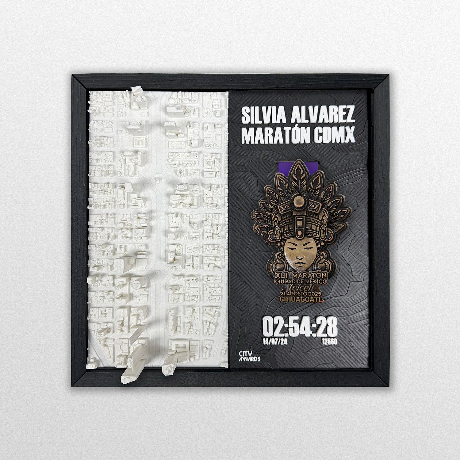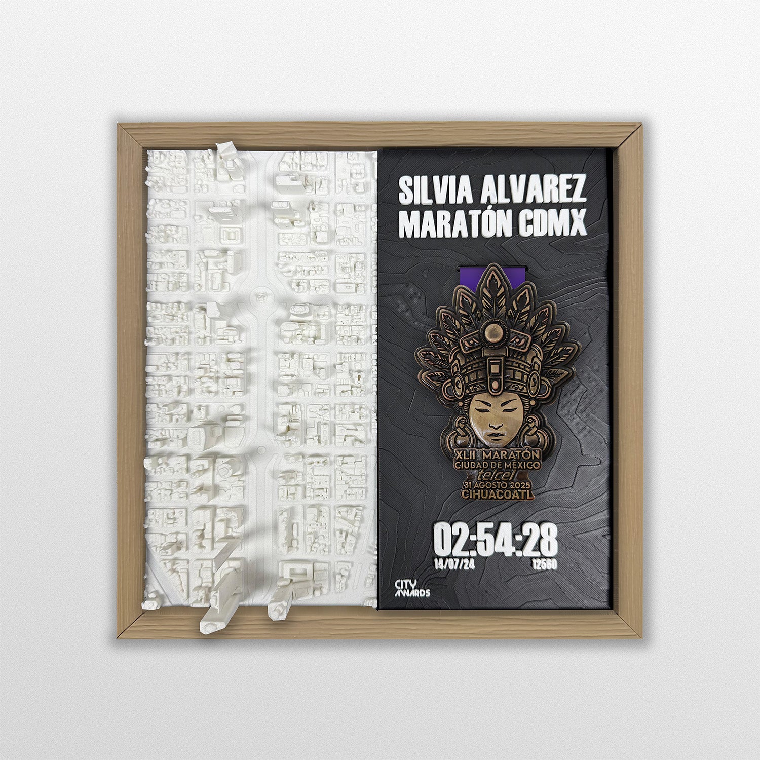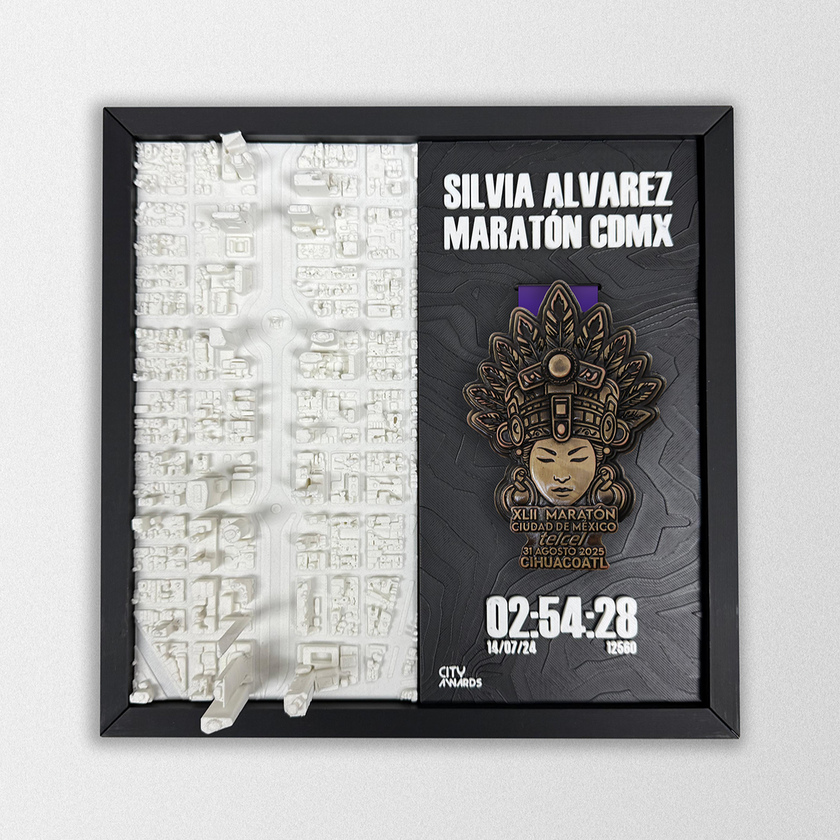 Ciudad de México, Paseo de la Reforma impreso en 3D. Placa impresa en 3D personalizada con tus datos de la carrera: Nombre, Tiempo/Finisher, Num de corredor, Fecha, o el texto que tu quieras. Marco impreso en 3D: Negro, Negro con textura madera, Cafe claro con textura madera.