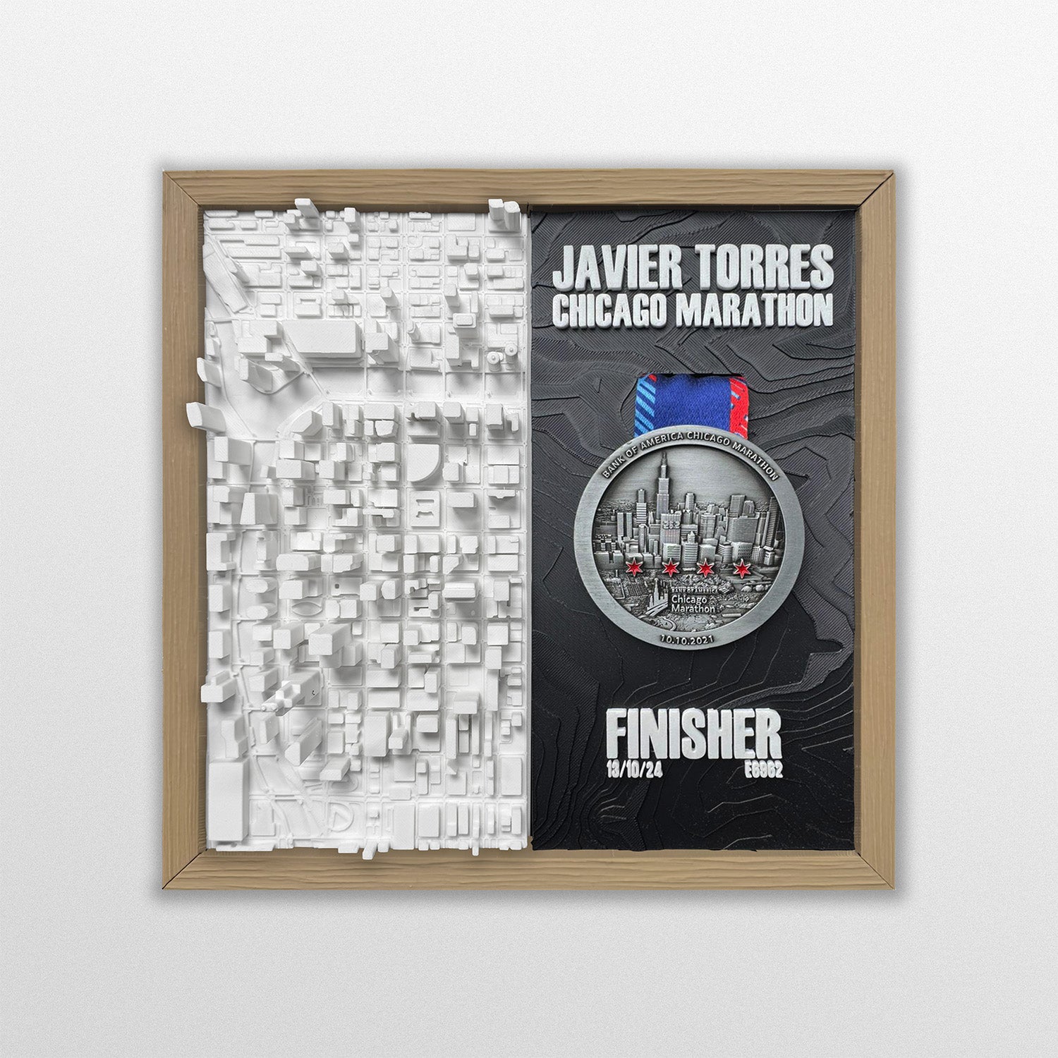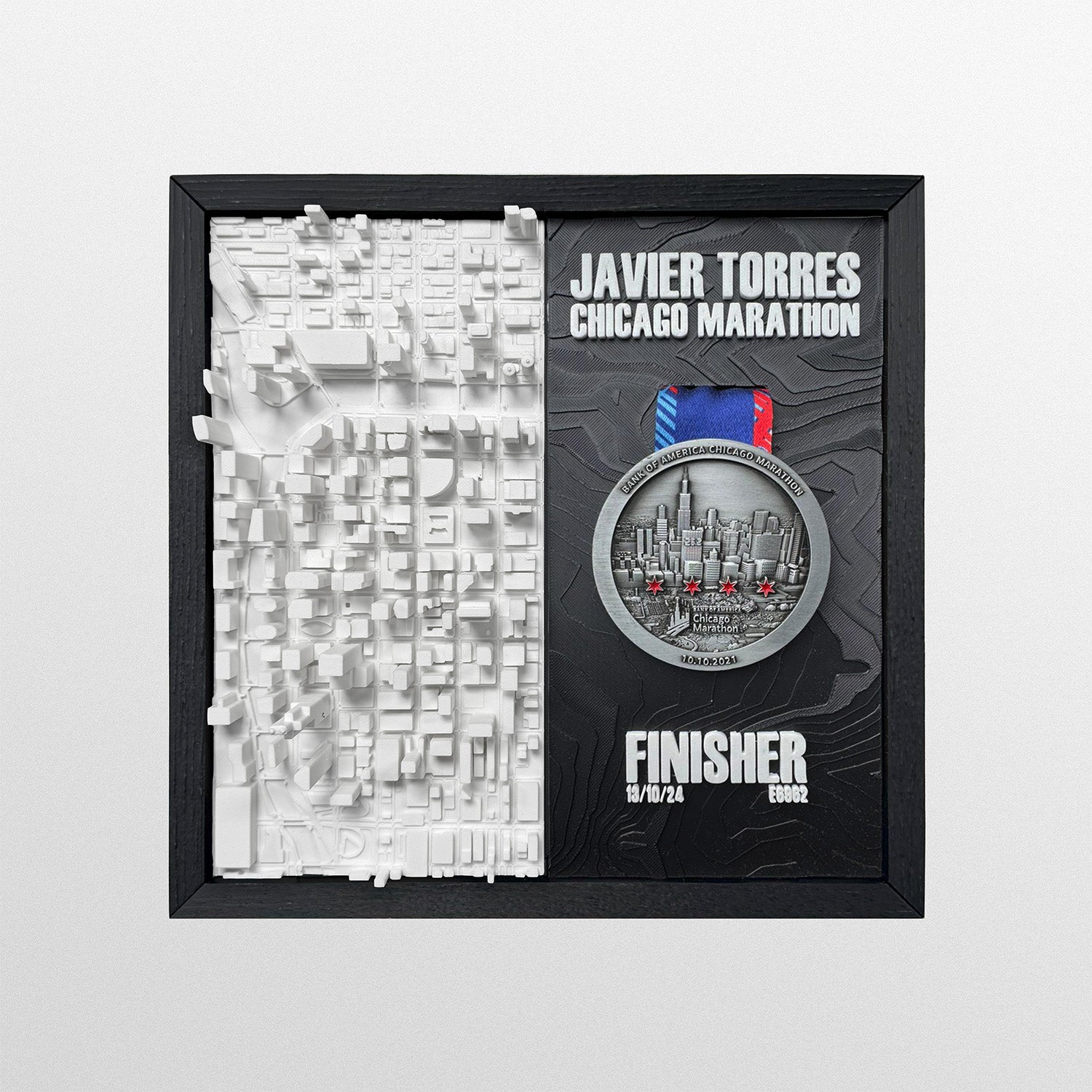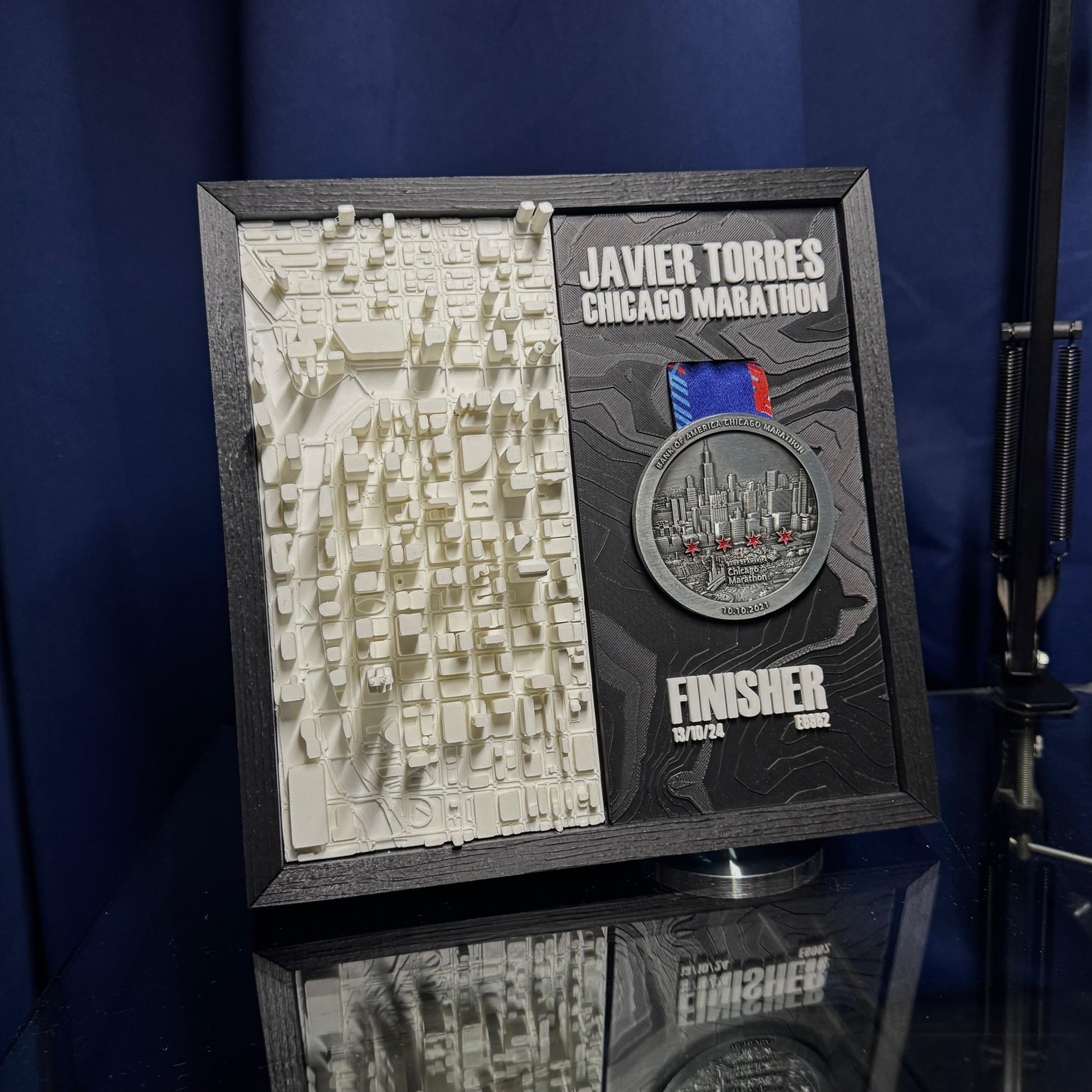 Impresión en 3D de ciudad de Chicago (zona de Willis Tower). Placa personalizada impresa en 3D para montar medalla. Marco impreso en 3D para poner en mesa o colgar en muro. Disponible en textura Madera color negro, madera clara o Negro liso.